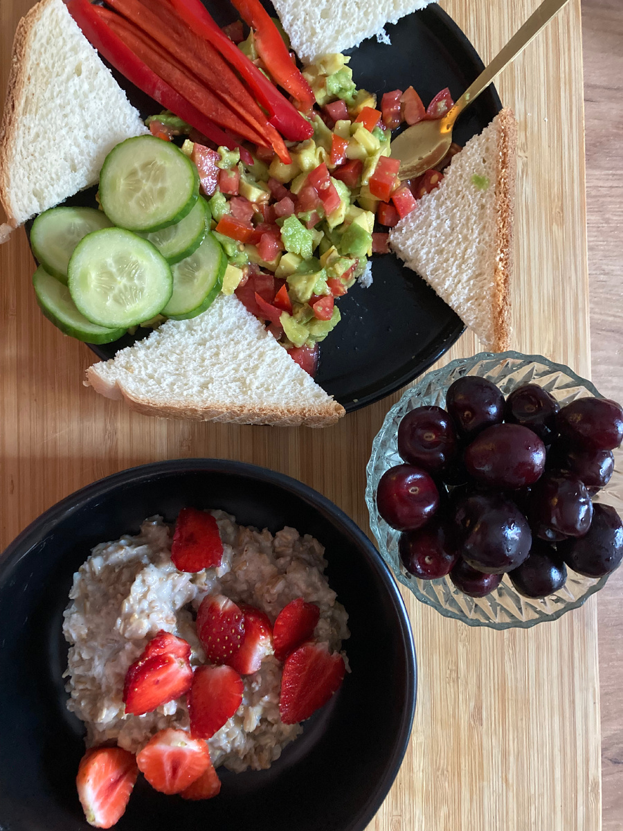 Каша геркулес с клубникой и полита медом. гуакамоле авокадо и помидор перец красный я порезала рядом.Огурчик я порезала кружочками. Лук и чеснок я конечно не добавляла с утра. Тосты я немного посушила на сковороде. А на десерт у меня черешня.Муж вчера принес . Наши кошки обнаглели и считают общий коридор своим домом . У нас стоит там кресло и они бегом в кресло.Дома места не хватает. Как вам наши бездомные? А это я их домой загоняю. Все бегут и падают. Так и бегаем по коридору за ними. А третья молодец сидит дома и за всеми наблюдает.Боится выходить. Вот так и живем.Никто не слушается. Хочу вам похвастаться , купила макароны из гречки. Оказались очень вкусные. Приготовила на обед. Печень залила соевым соусом и приправы индийские острые. Получилось такое блюдо. полезные свойства гречки: диетический продукт, нормализует показатели холестерина и артериального давления, благотворно влияет на работу сердца, оказывает антиоксидантное действие, насыщает организм легкоусвояемым бел