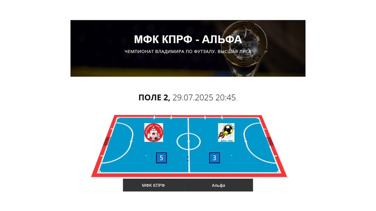 Чемпионат Владимира по футзалу. Высшая лига. 29.07.2025 г. МФК КПРФ - Альфа 5:3 (3:0) Обзор