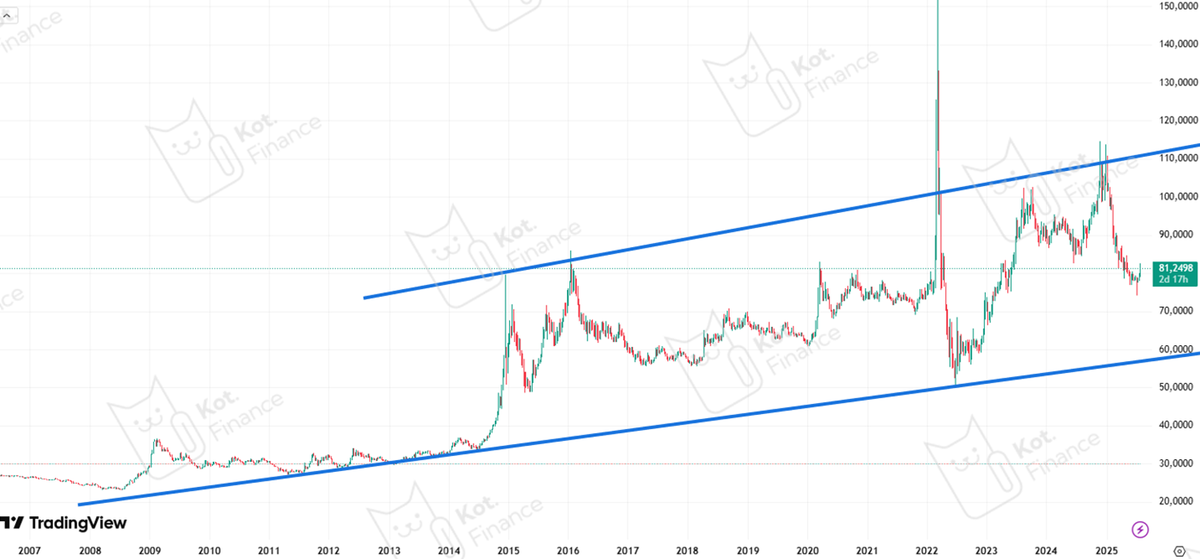 🔹укрепление рубля на 30% с начала года создает желание зафиксировать результат, ведь рубль исторически волатилен 🔹хоть на дистанции в 20 лет доллар не привлекателен, но непредсказуемые всплески (2008, 2014, 2020, 2022) позволяют пережить бурю Мы смотрим на валюту исключительно как необходимая диверсификация. 🧘Наша философия основана на тотальном разделении активов по классу, по эмитентам, отраслям, срокам. Не хватает только акций. Пока что… Почему не покупаем акции? 👈 Глобальный график показывает поддержку на уровне 57-60. Но дойдем ли мы до этой отметки – вопрос на миллион. После 2014 года к этому тренду вернулись лишь в 2022. Если же рассматривать проколы 2022 года как вверх так и вниз как форс-мажор: 🔹выход выше 110 – паника на фоне СВО, 💩ссанкций и риска потер