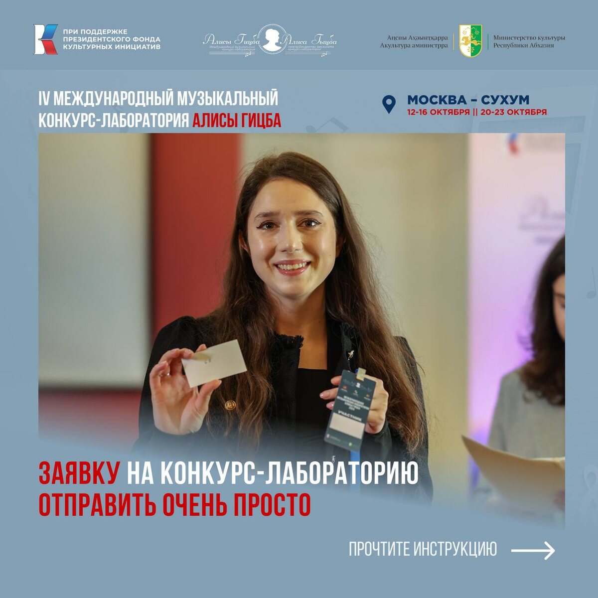 🎶 Как стать участником IV Международного музыкального конкурса-лаборатории Алисы Гицба? Это легко! 💯 Просто следуйте нашей инструкции из 7 шагов, и вы легко оформите заявку на участие в конкурсе. Шаг 1️⃣ ➡️Переходите по ссылке на сайт — и выполните всего несколько простых шагов, чтобы стать частью удивительного проекта! ❤️Проект «IV Международный музыкальный конкурс-лаборатория Алисы Гицба» проходит при поддержке Президентского фонда культурных инициатив. #конкурслабораториягицба #КонкурсЛабораторияАлисыГицба #АлисаГицба #Россия #Абхазия #ПФКИ #ТАСС