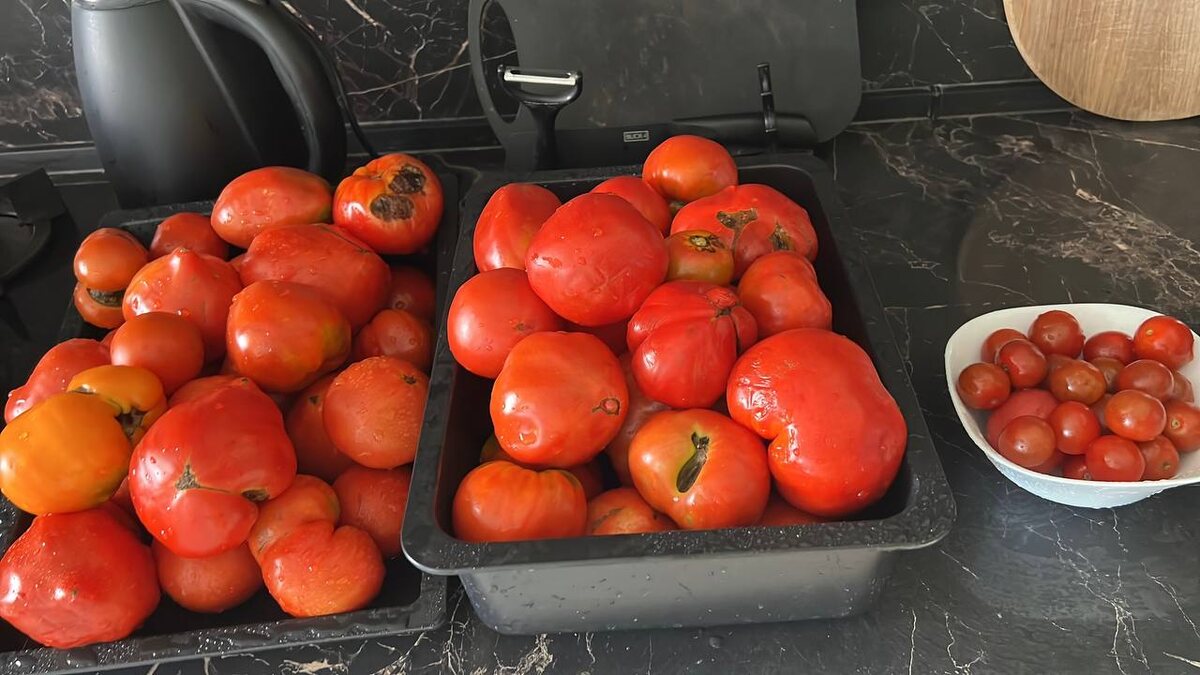 Всем привет, мои дорогие! У меня сегодня вкусная заготовка из томатов. Мы будем с вами делать томатный сок. Это вкусно и просто. Если у вас есть помидоры, и вы любите домашний томатный сок, то обязательно приготовьте его. Он получается очень вкусным, конечно же полезным и никак не сравнится с покупным. Берём спелые томаты и нарезаем их крупно. Наполняем ломтиками помидоров большую глубокую чашу, можно кастрюльку. Затем, подготовленные помидоры нам нужно перекрутить через мясорубку. Если у вас нет мясорубки, то можно воспользоваться обычным блендером, и всё это отпюрировать. Далее, берём сито,нам нужно процедить всю эту массу. Здесь очень тщательно всё делаем. Особое внимание уделяем мякоти. Она будет оставаться в вашем сите, но не спешите выбрасывать ее. Все это выкладываем на ровную поверхность решетки дигидрат и отправляем в сушилку. Просушиваем помидоры примерно 6 -7 часов. Потом, перемалываем все блендером и добавляем соль. Отличная специя получается! Если у вас нет дегид