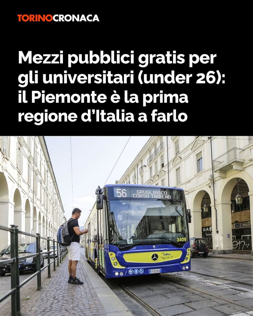 ❤️ НОВОСТИ ТУРИНА ✅ СПРАВКА: Эта новость переведена и размещена при помощи искусственного интеллекта Chat GPT без участия человека, в случае если вы заметили ошибку, или новость не соответствует реальному событию — сигнализируйте, исправим. 👉 Искренне Ваш Сержио Боттичелли: https://www.facebook.com/mercator.cz __________________ В Пьемонте студенты университетов младше 26 лет смогут ездить бесплатно. Да, даже иногородние. С лозунгом «Учиться — это право, передвигаться тоже», проект PieMove был официально запущен вчера, сделав Пьемонт первым регионом в Италии, который ввел такую меру. Около 107 тысяч студентов, обучающихся в одном из университетов Пьемонта, смогут бесплатно ездить на всех видах общественного транспорта — поездах, автобусах, трамваях и метро — в городах, участвующих в инициативе (Турин, Верчелли, Бьелла, Новара, Кунео и Асти). PieMove будет действовать на протяжении трех академических лет (2025–2028) с возможностью ежегодного продления абонемента. «Эта инициатива по