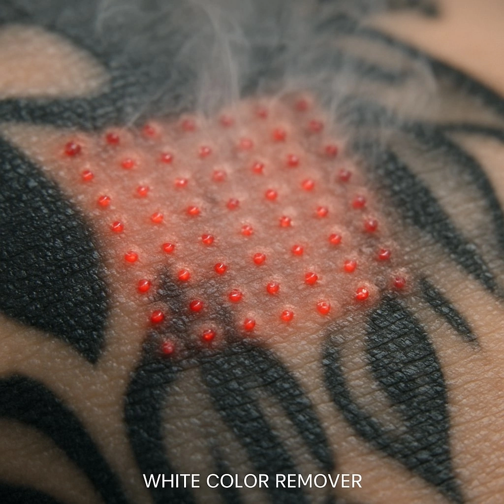 Лазерный фототермолиз – основа удаления интрадермальных красителей. Избирательное поглощение света частицей, ее нагрев, разрушение. Эффективно? Да. Но ограниченно. Эпидермальный Барьер: Роговой слой и меланин эпидермиса рассеивают и поглощают энергию лазера, снижая долю, достигающую целевого пигмента в дерме. - Энергетическая Дилемма: Для разрушения устойчивых или глубоких пигментов требуются высокие флюенсы. Риск: коагуляционный некроз окружающих тканей, гипопигментация, рубцевание. - Агломераты: Крупные кластеры пигмента сопротивляются полному разрушению за один сеанс. Необходимы повторные процедуры, продлевая процесс и кумулятивный риск. Сущность Комбинации White color remover : Два Этапа, Одна Цель: Химический Этап (Подготовка Поля): - Нанесение контролируемого пилинг-агента. - Научная Цель: Модификация структуры кожи (истончение/удаление части рогового слоя, воздействие на эпидермис) и целенаправленное ослабление связей в пигментных агломератах или их матрице. 2. Лазерный Э