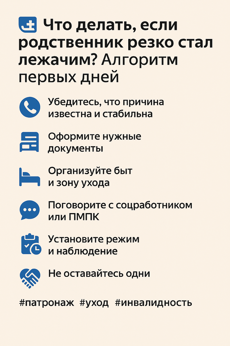 Это всегда происходит неожиданно. Вчера ещё ходил по квартире, а сегодня — не встаёт. Стал вялым, отказывается от еды, много спит. Или упал, травмировался, после больницы вернулся другим. Что делать в первые дни? Куда звонить, что оформлять, как наладить уход? Рассказываем пошагово. ✅ Если человек уже был в больнице, и вы знаете диагноз — уточните у лечащего врача: ✅ Если человек не обследовался — вызывайте врача: 📌 Иногда лежачесть — обратима. Не списывайте всё на старость или «возраст». Это может быть инфекция, обезвоживание, инсульт, интоксикация, воспаление или даже недавнее лечение. 📁 Вот список того, что понадобится в ближайшее время: 🛏 Если больной теперь в постели — даже временно: 📦 Даже простые вещи — одноразовые простыни, складной столик, лампа — сильно облегчают жизнь. 👥 Возможно, вам положены: Обратитесь в социальную защиту или через портал «Госуслуг». 🔄 Первые дни — самые важные. Следите за: 🕑 Составьте график переворотов (каждые 2–3 часа), кормлений и приёма лекарс