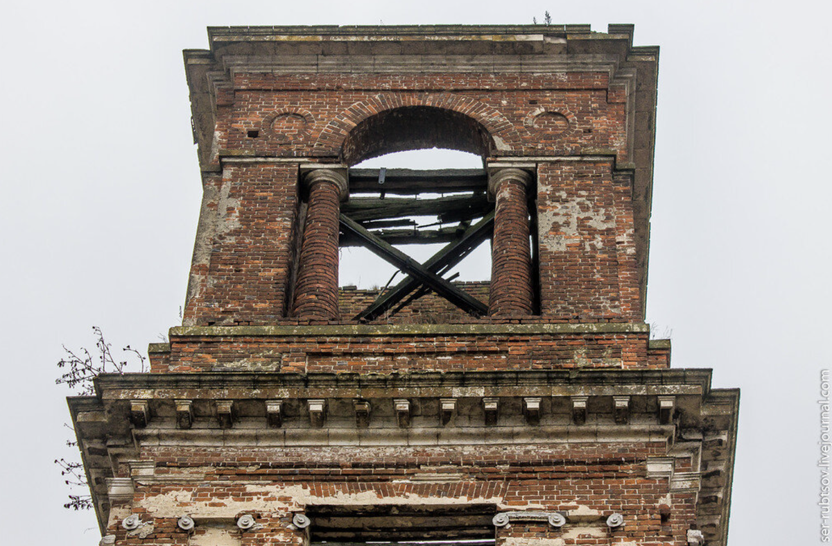 Построенный в XIX веке на средства местных помещиков, он впечатляет лаконичной архитектурой в стиле позднего классицизма: уцелевшие фрагменты колонн у входа, полуразрушенная апсида и остатки купола, открытого небесам, создают силуэт, узнаваемый в очертаниях руин. Внутри угадываются фрагменты росписей с ликами святых.