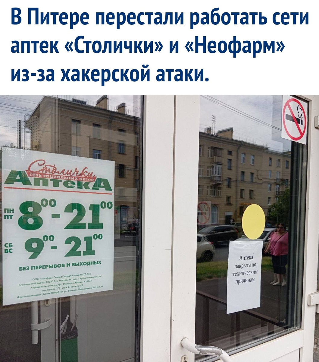 ❗ Кассовые системы не функционируют, IT-инфраструктура вышла из строя, а сотрудники уже разошлись по домам. Киберпреступники нанесли удар по инфраструктуре сразу двух ведущих аптечных сетей. Согласно информации в СМИ, сеть «Столички» прекратила работу по всей Москве, а «Неофарм» — в Москве, Подмосковье и Санкт-Петербурге. Онлайн-заказы недоступны, учет товаров остановлен, и приобрести даже самые необходимые медикаменты становится практически невозможно. Другие новости