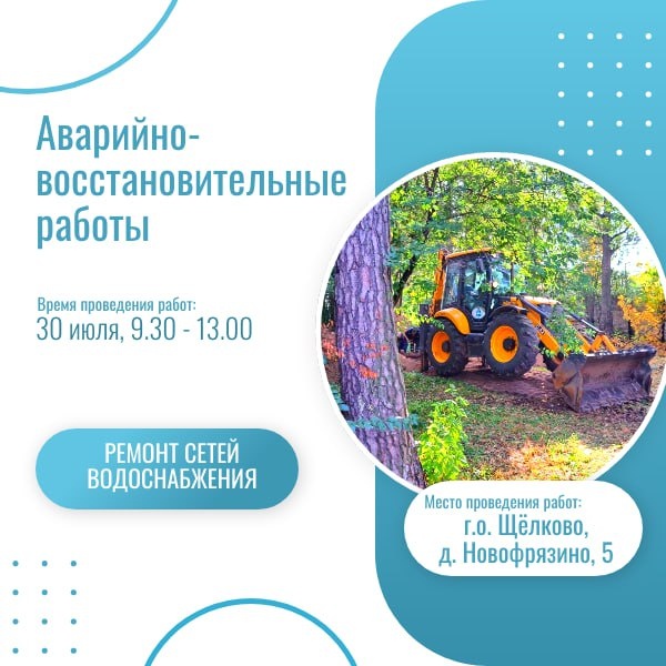 🚧 Аварийно-восстановительные работы на сетях холодного водоснабжения в деревне Новофрязино В связи с проведением аварийно-восстановительных работ (ул. Лесная, 5) на трубопроводе диаметром 50 мм 30 июля, с 9.30 до 13.00 будет отключена холодная вода в ИЖС по адресам: - ул. Островского, дома 1 - 28 - ул. Лесная, дома 1 - 18 - ул. Толстого, дома 1 - 34 Приносим извинения за доставленные неудобства. Телефон аварийно-диспетчерской службы водоканала: 84965621172.