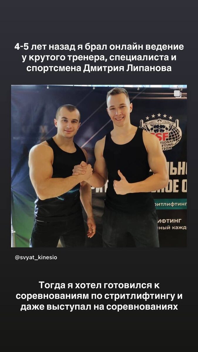🏋️♂️ Я Тренируюсь с чемпионом по calisthenics 🔥🌍 Многие из вас знают, что я тренируюсь регулярно — порой до 5 раз в неделю. 90% моих тренировок — это работа с собственным весом тела. Что такое calisthenics? Это не просто подтягивания и отжимания. Это силовые и статические элементы, которые требуют мощи, контроля и техники: флажки, передние висы, планш, выходы силой и не только. Благодаря калистенике я развил функциональное и атлетичное тело, которое: – умеет работать в любых условиях – не зависит от зала и оборудования – готово к движению в любой момент Но были элементы, к которым я не мог подступиться сам: 👉 планш, 👉 передний вис, 👉 и продвинутые силовые комбинации. Чтобы выучить их — я сделал то, что сам рекомендую клиентам: обратился к профессионалу. Сейчас я, как и мои ученики, тренируюсь под онлайн-ведением: 📲 отправляю видеоотчёты 📈 следую индивидуальной программе 📆 6 тренировок в неделю, объём — серьёзный! Почему это удобно: ✅ Гибкий график — тренируюсь в своё