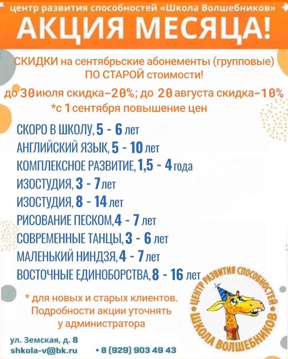 ✨ АКЦИЯ МЕСЯЦА, а точнее лета!🎉 🎁СКИДКИ на сентябрьские абонементы (групповые) ПО СТАРОЙ стоимости! 🔹Английский язык (5-10 лет) 🔹Скоро в школу (1 и 2 года до школы) 🔹Комплексное развитие (1,5-4 года) 🔹Изостудия (3-7 лет) 🔹Изостудия (8-14 лет) 🔹Рисование песком (4-7 лет) 🔹Современные танцы (3-6 лет) 🔹Восточные единоборства (8-16 лет) 🔹Маленький ниндзя (4-7лет) 🏢 Центр Развития "ШКОЛА ВОЛШЕБНИКОВ" 📍 г.Чехов, микрорайон Губернский, ул.Земская, д.8 🔗 Записаться: https://wa.me/+79299034943 ⭐Разместить публикацию ⭐Поддержать канал голосом #детямЧехов #интересноЧехов ✅ Мероприятия Чехов https://dzen.ru/id/66cc4b48e9ef144699238a51 http://vk.com/chekhov_events http://dzen.ru/chekhov_events