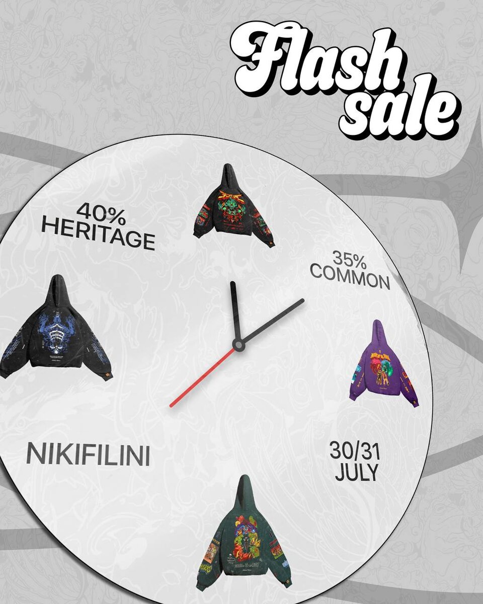 Обычно FLASH SALE это что-то позитивное Ура! Скидки! Но нам несколько грустно отказываться от лимиток с холстами — в них вложено огромное количество сил. Поэтому сегодня ура скидки, но с легким налётом грусти. Это решение далось нам тяжело — именно с них всё началось. Холст стал нашей подписью: плотная фактура, чёткие края, масштабные сцены — узнаваемая графика, которая сделала NIKIFILINI тем, кем мы стали. Но сейчас мы идём дальше. Какие-то лимитки вернутся с новым дизайном. Некоторые — никогда. Мы бы сказали, какие именно, но пока обсуждаем, согласовываем, спорим, опять обсуждаем. Как только будет редизайн - вы узнаете. Поэтому каноничный дизайн даем возможность купить сейчас. Мы создали [раздел HERITAGE] — туда вошли все худи с каноничным дизайном. Это ваш шанс забрать их в оригинальном виде со скидкой 40%. На ВСЕ остальные позиции скидка 35%!