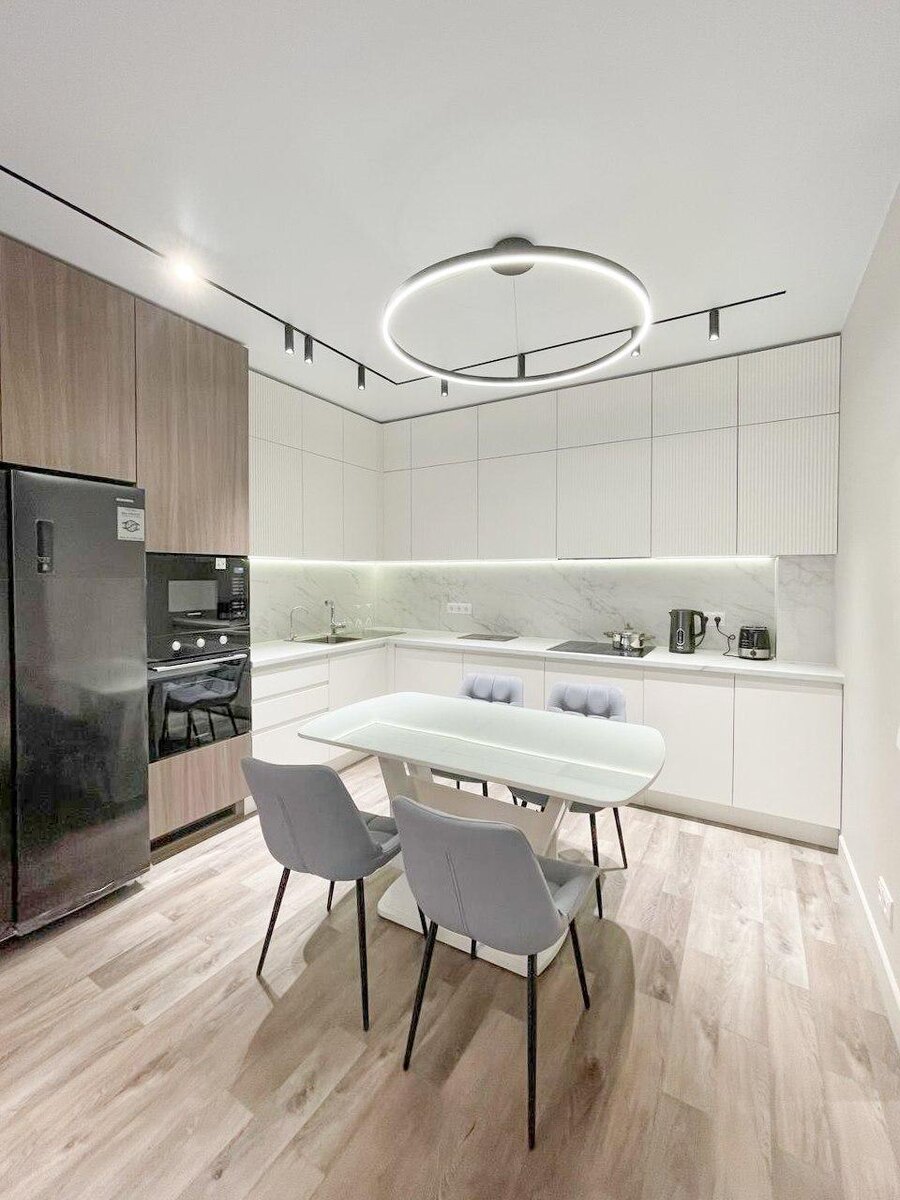 Освещение здесь играет особую роль. Споты выстраивают ритм и графику, а люстра в стиле хай-тек становится акцентом, не нарушая общей гармонии.