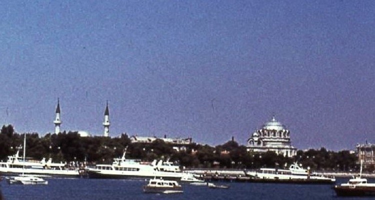 Когда отплывали от Евпатории, сделал интересный снимок – на берегу хорошо видны стоящие рядом мусульманская мечеть с минаретами и купол православного собора.