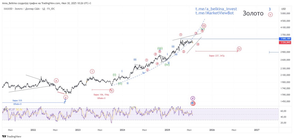 #Gold Долгосрочно сохраняю позитивный взгляд по золоту. Краткосрочно – продолжается консолидация цены в узком диапазоне, состояние перекупленности по RSI сняты. По ВА – движение формируется в конечной диагонали в волне [3] of v of (v) of [iii] глобального импульса. Текущее движение больше подходит для продолжения треугольника в волне (Х) of [3] of v of (v) of [iii], нежели для волны B of (Y) of [3] of v of (v) of [iii] – в ней имеются натяжки по разметке локального импульса вниз, при этом движение (опять же локально) выглядит незавершенным. Т.о., гармоничнее предположить развитие субволны E of (X) треугольника с дальнейшим выходом в волну (Y) of [3] of v of (v) of [iii]. Не является ИИР 💪 Бот Закрытого Канала (подписаться из-за границы, пишите личным сообщением)