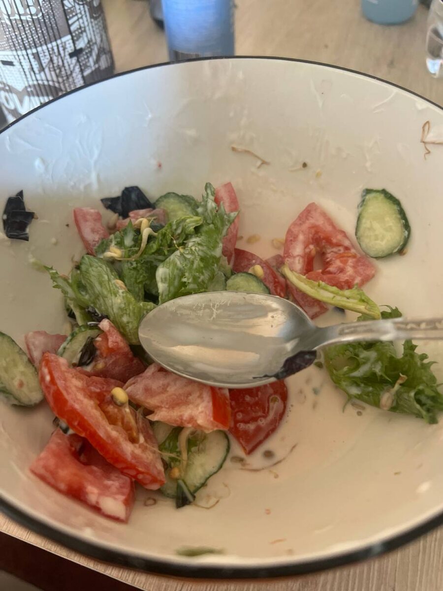 Салат я разумеется не весь съела, помидор большой. На ужин будем доедать.