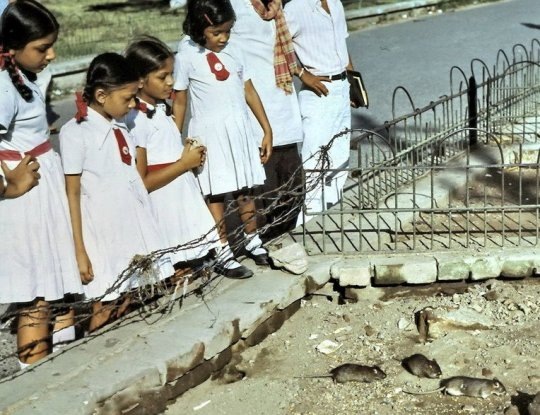 Индия - лучшее место для вредителей и разносчиков) Я уже показывала вам Карни Мата - крысий храм. А вот и крысопарк: В Калькутте есть свой собственный парк для крыс, расположенный в северной части Майдана, большого зелёного комплекса Калькутты, состоящего из садов и спортивных площадок. Парк Керзона, небольшая территория с деревьями и огороженными участками зелени, находится недалеко от трамвайной остановки и площади Бинай, Бадель и Динеш Бэг (также известной как Б.Б.Д. Бэг) в самом центре города. Здесь обитает большая колония толстых и очень счастливых крыс. Говорят, что крысы "…укрываются у подножия статуи могущественного промышленника". В некоторых описаниях говорится, что крысы содержатся в проволочной клетке, но, похоже, она нужна лишь для защиты их нор от человеческих ног. Вот как это выглядит: Обычно ночные переносчики болезней сновали по пыльной земле, с которой была вычищена каждая травинка, забираясь и вылезая из траншей и нор, которые делали землю похожей на миниатюрное поле