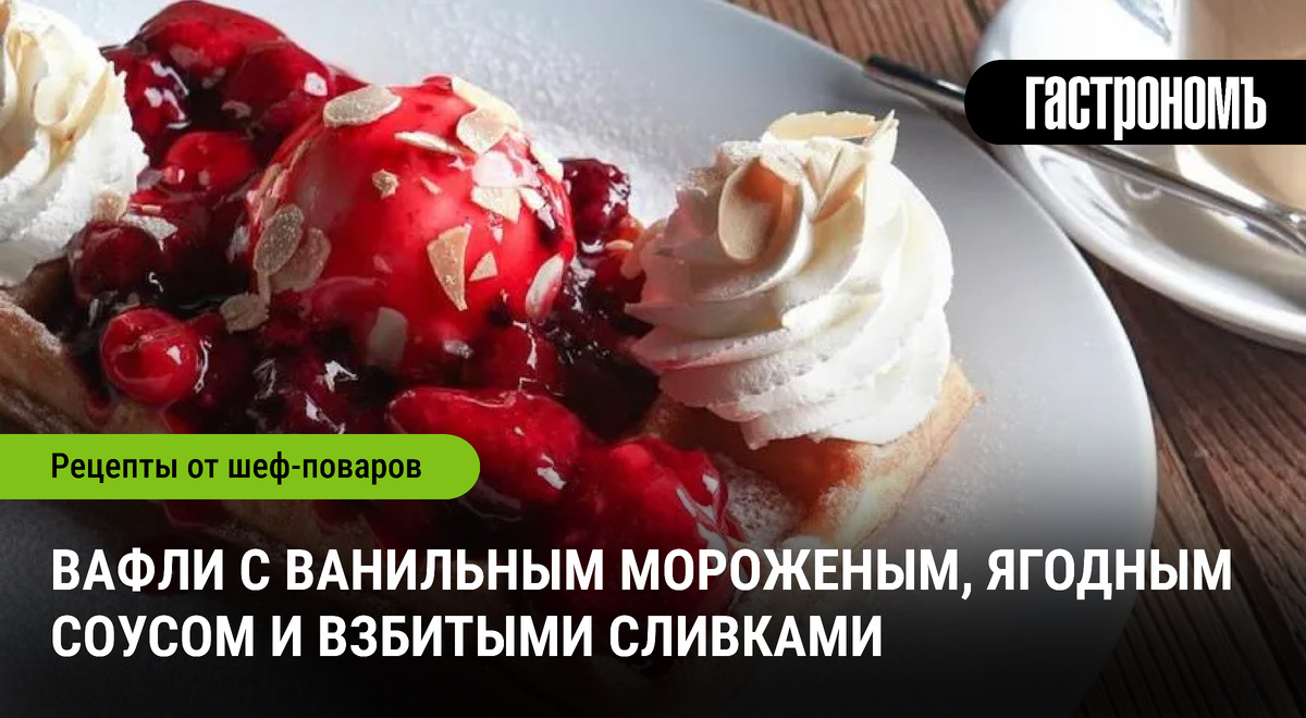 Вафли с ванильным мороженым, ягодным соусом и взбитыми сливками