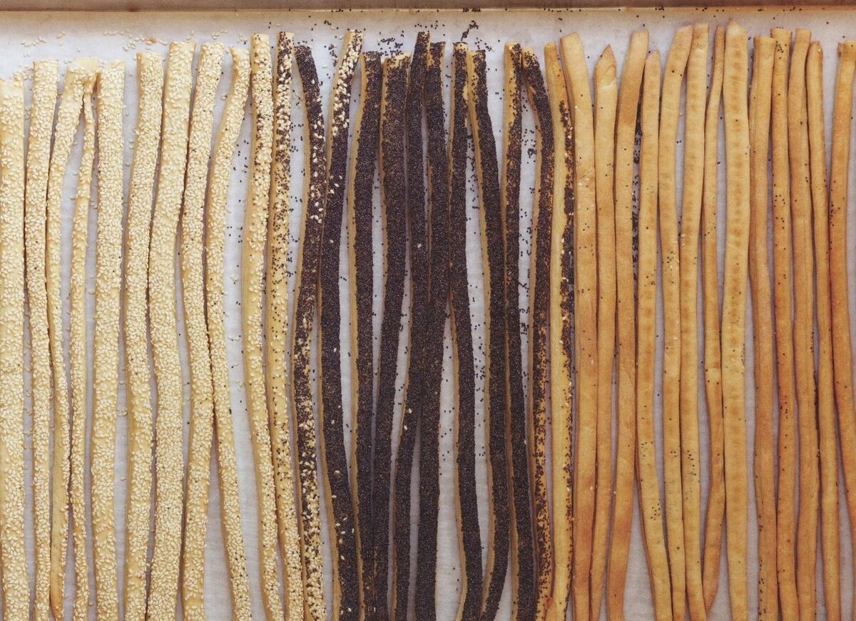 ГРИССИНИ НА 3,87 КГ ТЕСТА. ТЕМПЕРАТУРА ТЕСТА К КОНЦУ ЗАМЕСА 26 °С Мука с высоким содержанием белка 2300 г Сухие инстантные дрожжи 40 г Молоко комнатной температуры 1000 г Сливочное масло, размягченное 340 г Оливковое масло 90 г Соль 60 г Солодовый сироп 40 г Оливковое масло (для смазывания) сколько необходимо Посыпки: крупная соль, мак и кунжут (по желанию) сколько необходимо 1. Смешайте в миске муку и дрожжи. Добавьте в дежу молоко, сливочное и оливковое масло, соль и солодовый сироп, затем всыпьте муку и дрожжи. Замешивайте крюком для теста на низкой скорости 4 минуты, а после — на средней скорости еще 3 минуты. Тесто должно быть очень крутым. Продолжайте замес до полного развития глютена. Дайте тесту отдохнуть 15 минут. 2. Брожение в блоке в течение примерно 30 минут, пока тесто не увеличится в объеме в два раза. 3. Застелите противни бумагой для выпечки. 4. Скалкой раскатайте тесто в прямоугольники длиной 30 см и шириной в размер роликов на машине для пасты. 5. Раскатайте тес