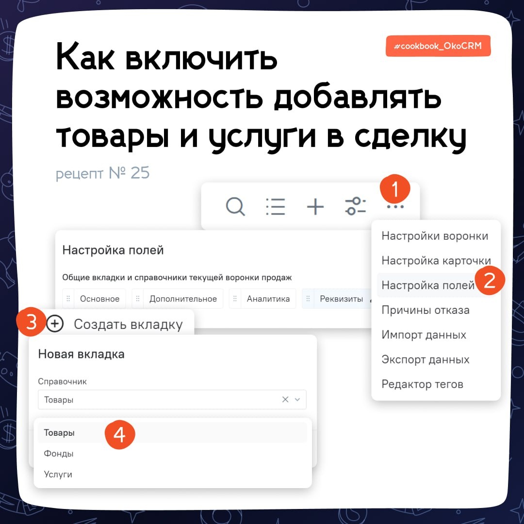 ❓Как включить возможность добавлять товары и услуги в карточку сделки Нам в техподдержку написал Владимир из Нижнего Новгорода Дорогая OkoCRM, подскажите пожалуйста, как сделать так, чтобы у меня появилась возможность добавлять товары в сделку? Справочники завёл, но в карточках сделок их нет :( Дорогой Владимир, это легко: 1⃣ Заходим в нужную воронку продаж и справа сверху нажимаем троеточие 2⃣ Выбираем вкладку «Настройка полей» 3⃣ Нажимаем «Создать вкладку» 4⃣ Выбираем нужный справочник и нажимаем сохранить Готово! Теперь товары из конкретного справочника можно добавлять в сделки на конкретной воронке продаж. Вот подробная инструкция по настройке (п.п. 43-50) → Пользуйтесь 👌 #Cookbook_OkoCRM