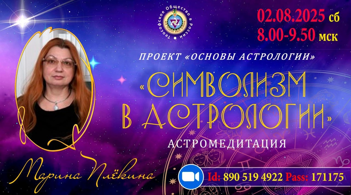 🪷🪷🪷Дорогие друзья, приглашаем вас принять участие в АСТРОЛОГИЧЕСКОЙ МЕДИТАЦИИ! 🌗ДАТА: 2 августа (суббота) 🌠ВРЕМЯ: 8:00 (мск). 🌐Быстрый вход в лекторий по ссылке: https://clck.ru/37Q6hC. ZOOM Id: 890 519 4922 Код: 171175 ✨ВЕДУЩАЯ: Марина Вячеславовна Плёкина, профессиональный астролог, психолог, нумеролог, космоэнергет, г.Москва. ❗️Добро пожаловать на новые официальные каналы ТО в России: ▫️Вконтакте: https://vk.com/theosophyrussia ▫️Дзен: https://dzen.ru/profile/editor/ts_russia ▫️YouTube: https://www.youtube.com/@TS_Russia ❗️Подписка на рассылку Теософского общества в России и по любым вопросам: secretary@ts-russia.org