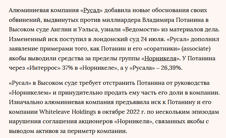 Вот наткнулся на новость о том, что Дерипаска не никак не может успокоится и считает, что Потанин что-то недоплачивает на его долю в ГМК "Норильский никель".