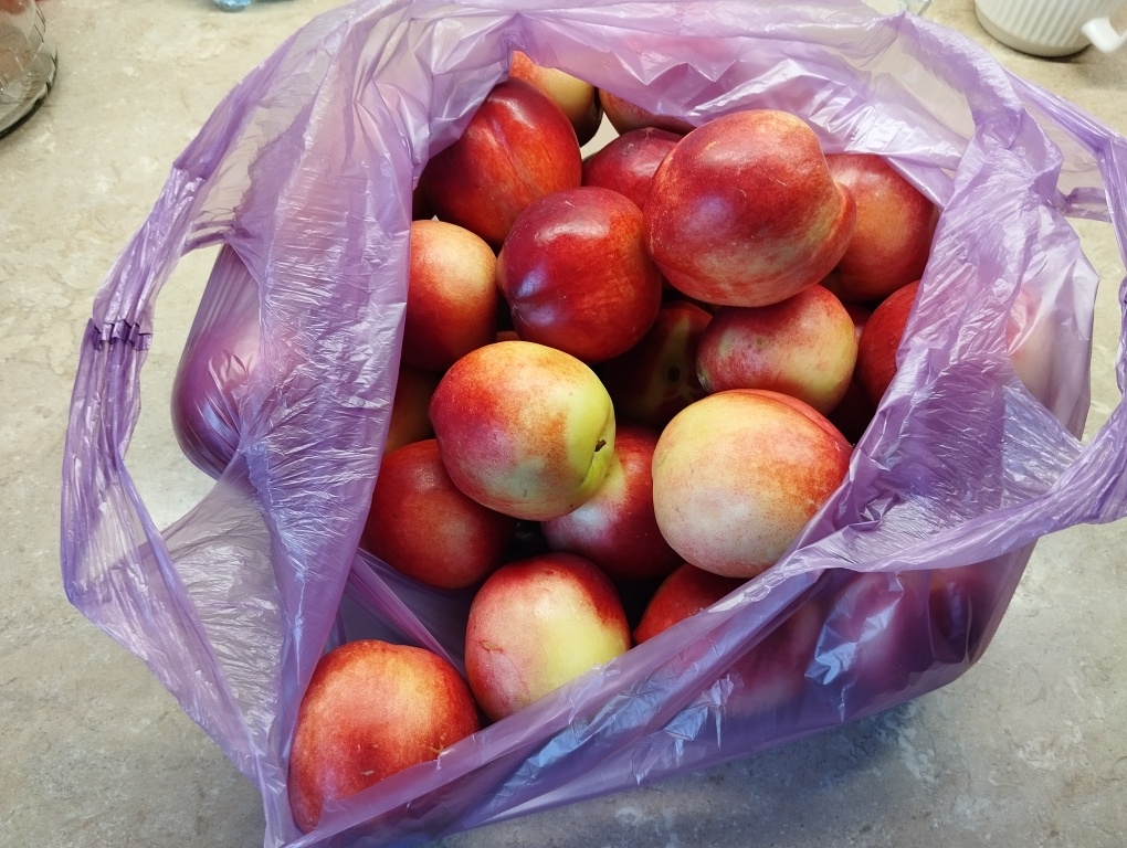 Здесь у меня 4кг ароматных белых нектаринов. Даже жалко было измельчать их. Часть мы съели.