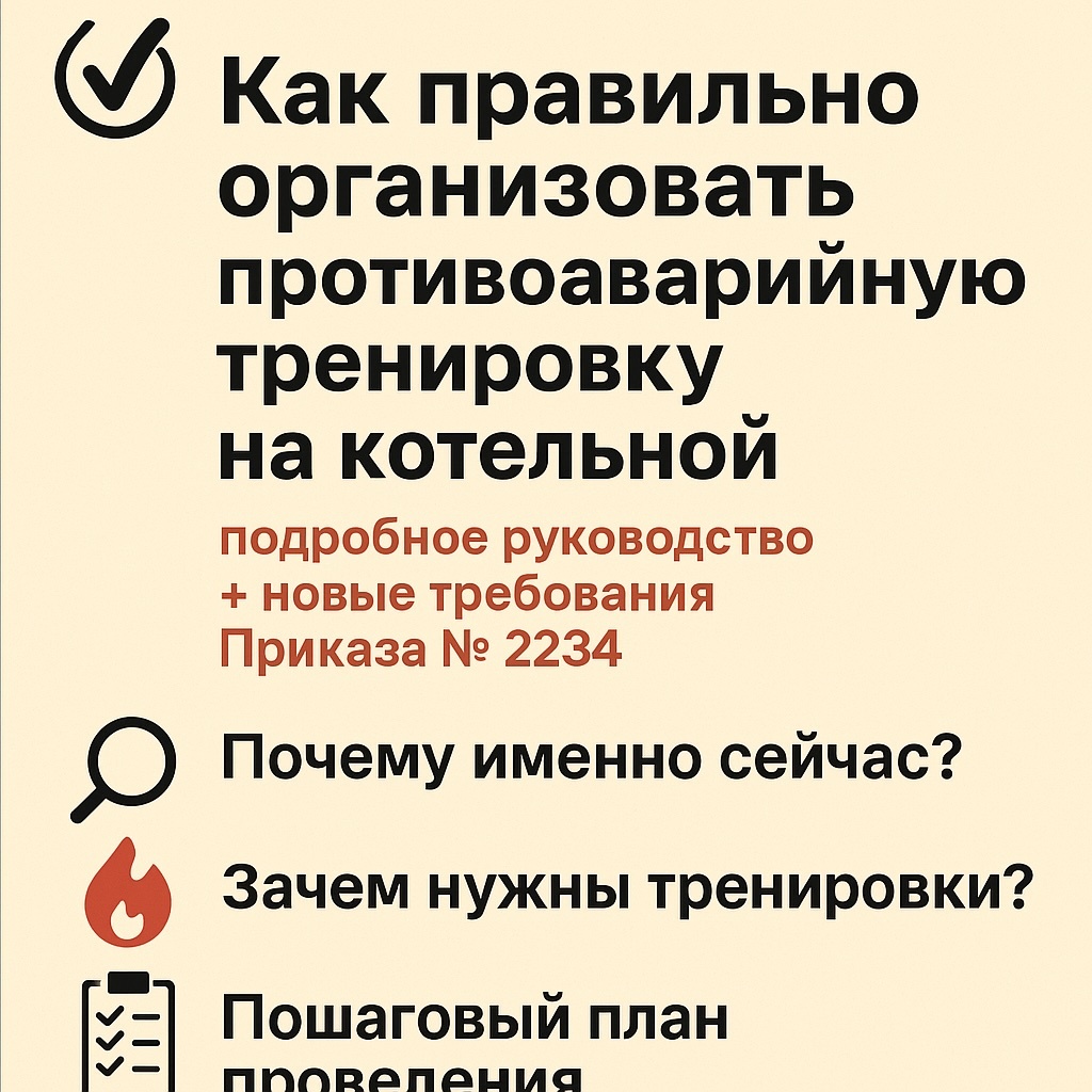 📢 Почему мы говорим об этом именно сейчас? Подготовка к отопительному периоду требует документального подтверждения готовности персонала. В числе обязательных мероприятий — противоаварийные и противопожарные тренировки, закрепленные: ✔ в Правилах технической эксплуатации тепловых энергоустановок (ПТЭ ТЭУ), п. 2.3.44–2.3.51; ✔ в Правилах промышленной безопасности при эксплуатации оборудования под избыточным давлением, п. 236; ✔ в оценочном листе готовности (п. 9.3.10): копии утвержденных программ противоаварийных тренировок и журналы проведения тренировок. Эти документы — обязательная часть проверки готовности и влияют на индекс готовности. ⸻ 🔍 Зачем нужны противоаварийные тренировки? Работа котельной связана с рисками: • высокое давление; • горючие материалы; • газ, пар, горячая вода. Любая ошибка может привести к: 🔥 пожару; 💥 взрыву; ❄ остановке теплоснабжения. Тренировки позволяют: ✔ отработать алгоритмы действий в ЧС; ✔ проверить подготовку персонала; ✔ выявить слабые м