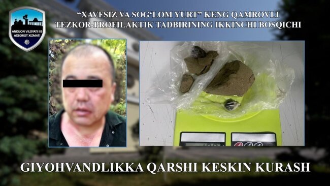 Сотрудниками органов внутренних дел было проведено оперативное мероприятие в городе Ханабаде Андижанской области. В ходе мероприятия был остановлен и проверен житель Андижанского района, 1983 года рождения, который вёл себя подозрительно, находясь в центре города. При проверке гражданина, в присутствии понятых, у него удалось выявить 200,1гр. наркотического вещества гашиша. Отмечается, что он планировал осуществить сбыт данного наркотического вещества.