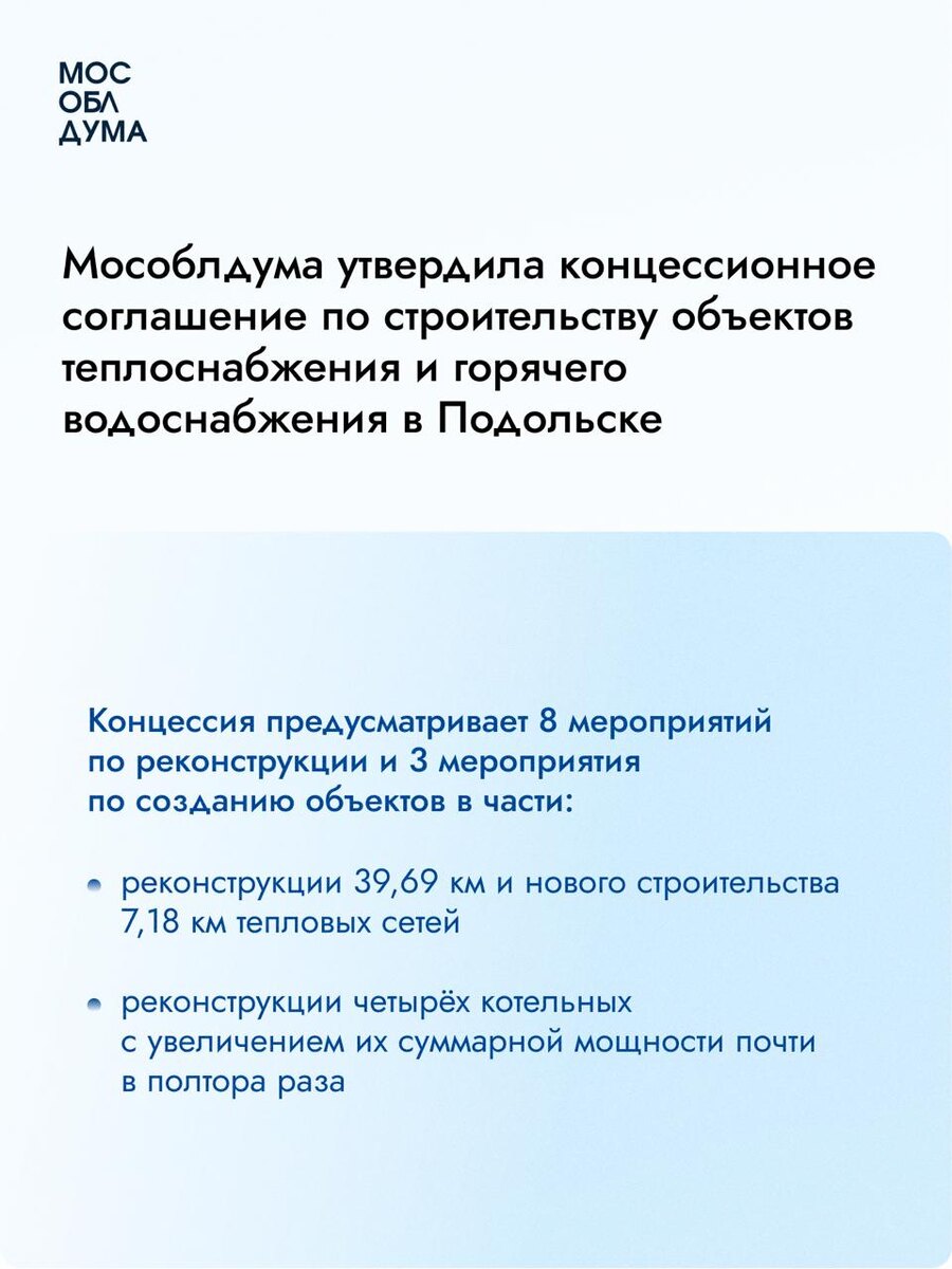 ⚡️Мособлдума в ходе 116-го заседания утвердила заключение концессионного соглашения, которым предусмотрено строительство объектов теплоснабжения и горячего водоснабжения в Подольске Концессия заключена между городским округом, Московской областью и «Теплоэнергетической компанией-2». Планируется, что на создание и реконструкцию объектов концессионер направит свыше 4,2 млрд. рублей, сумма может измениться после государственной экспертизы проектной документации. Подробнее на сайте Мособлдумы 💼 | Подписаться | Обсудить