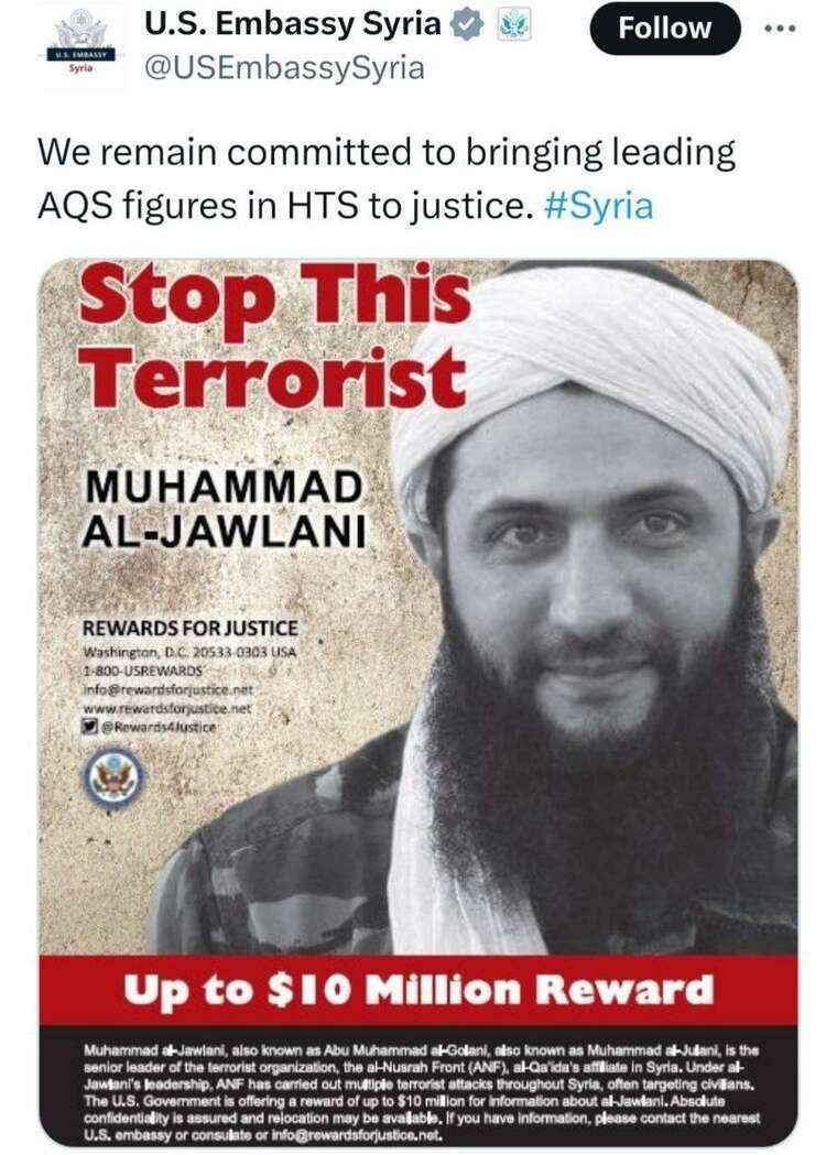 Любопытно, что именно такую же сумму — $10 млн — Вашингтон в своё время назначил за другого одиозного фигуранта своего розыска, Абу Мухаммада аль-Джулани, главаря сирийской *«Хайат Тахрир аш-Шам» (бывшая «Джабхат ан-Нусра»). Сегодня Джулани, несмотря на всё прошлое, уже не "террорист", а глава новой "свободной Сирии"