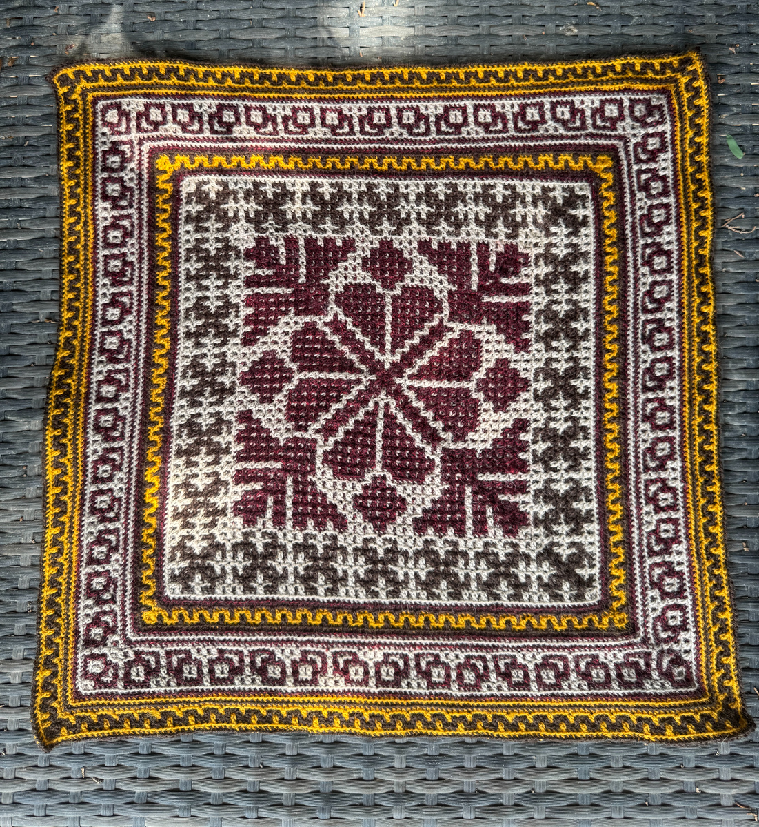 Квадратный мотив из коллекции «10 нескучных подушек». Пряжа: Nako Boho (400/100), цвета горчица, кофейный, коричневый и меланжевый бордо. Крючок: №4. Размер мотива: 46 см. Подойдет либо как одна сторона для подушки 50*50 см, либо как наволочка-конверт для подушки 35*35 см. Техника вязания: мозаика из центра (урок можно посмотреть здесь).