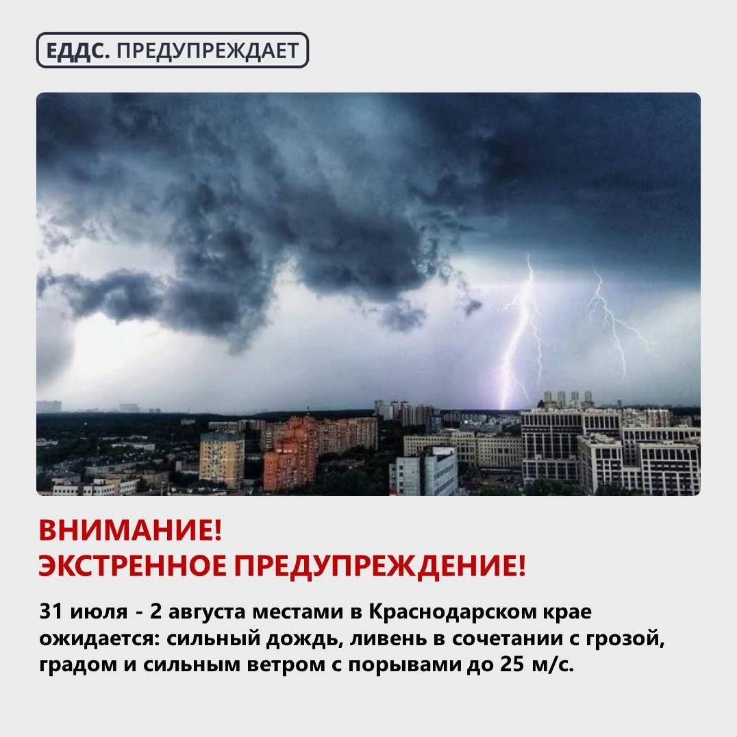 ⚠️🌧 Штормовое предупреждение на 31 июля – 2 августа. На территории Краснодарского края, включая город Горячий Ключ, ожидаются сильные дожди, ливни, местами в сочетании с грозами, градом и сильным ветром с порывами 20–25 м/с. Будьте внимательны и осторожны! ☎️ В экстренных ситуациях звоните: 112.