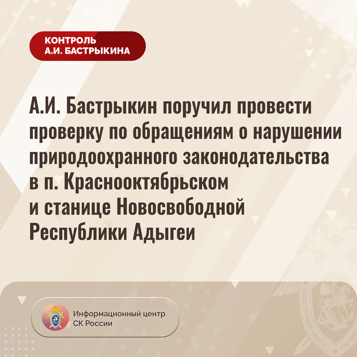 А.И. Бастрыкин поручил провести проверку по обращениям о нарушении природоохранного законодательства в п. Краснооктябрьском и станице Новосвободной Республики Адыгеи В Информационный центр СК России поступили обращения по вопросу нарушения природоохранного законодательства в поселке Краснооктябрьском и станице Новосвободной Республики Адыгеи. С июня текущего года вблизи населенных пунктов осуществляется незаконное сжигание древесины для производства угля, в связи с чем граждане задыхаются от едкого дыма. Многочисленные обращения в компетентные органы результатов не принесли, мер к устранению нарушений не принимается. Председатель Следственного комитета Российской Федерации Александр Иванович Бастрыкин поручил руководителю СУ СК России по Республике Адыгее Василию Анатольевичу Ларину провести процессуальную проверку и представить доклад о ее предварительных и окончательных результатах. Исполнение поручения, а также ход процессуальной проверки поставлены на контроль в центральном аппара