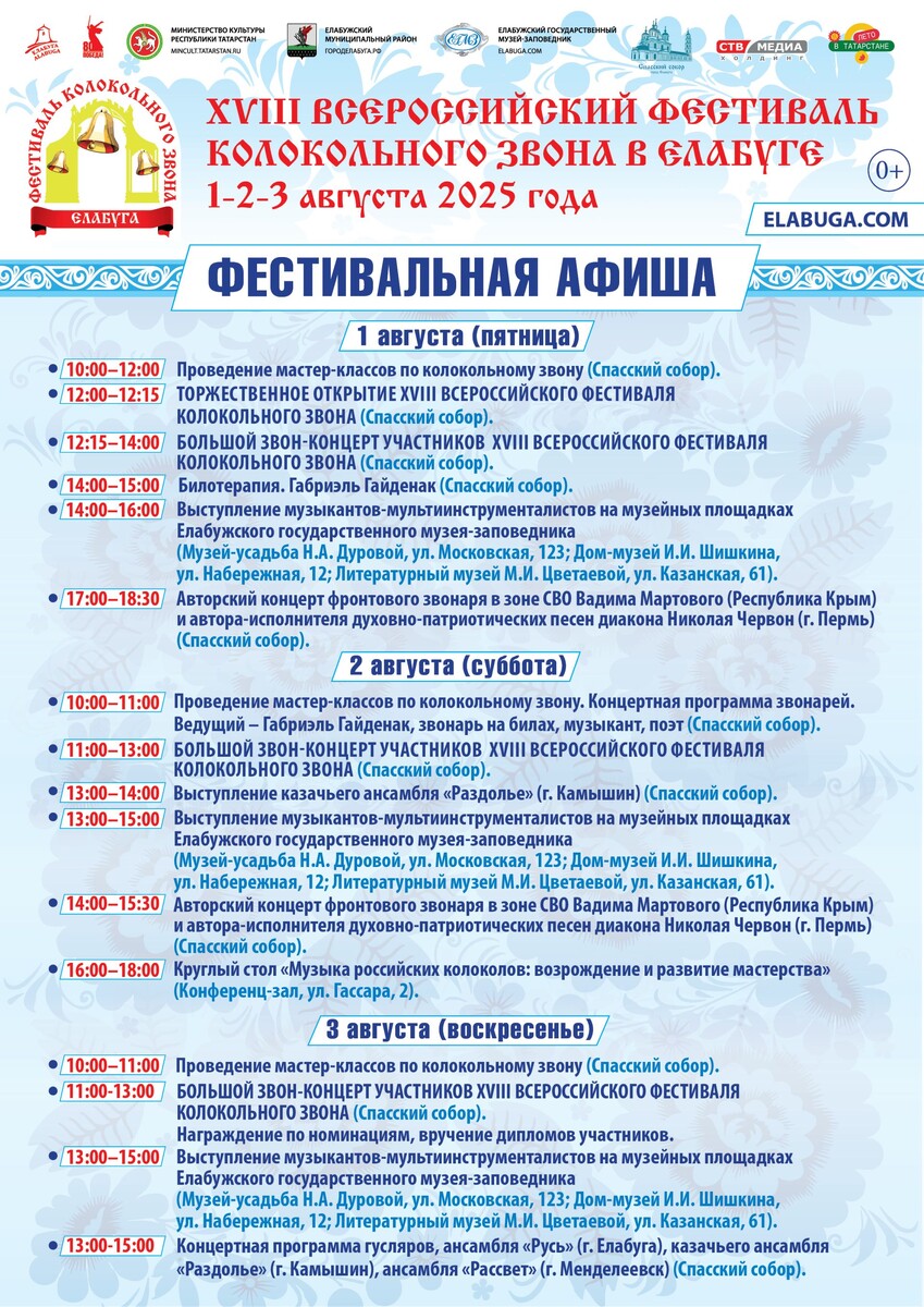 XVIII Всероссийский фестиваль колокольного звона пройдет в Елабуге 1, 2 и 3 августа 2025 года (0+). На фестиваль приедут более 200 участников - мастера-профессионалы, служители храмов, учащиеся и звонари - выпускники школ колокольного искусства. Программу украсят фольклорные коллективы и вокальные ансамбли, авторы и исполнители духовно-патриотических песен, мастера игры на древнерусских инструментах — колесной лире и гуслях. Выступления пройдут на колокольне елабужского кафедрального собора во имя иконы Спаса Нерукотворного и на передвижных звонницах. Три звон-концерта 1, 2 и 3 августа - на площади перед Спасским собором. В дни фестиваля состоятся мастер-классы по звонарскому искусству и народному танцу; круглый стол «Музыка Российских колоколов возрождение и развитие мастерства» с участием звонарей, историков, краеведов. Инициатором Всероссийского фестиваля колокольного звона с 2008 года является Елабужский государственный музей-заповедник. Главные цели мероприятия - сохранение и попу