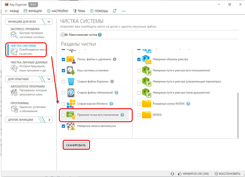 Инструмент «Чистка системы» -> отметьте галочкой пункт «Прежние точки восстановления» -> кнопка «Сканировать». Щелкув на раздел «Прежние точки восстановления» просмотрите какие точки восстановления есть. Снимите галочки с тех, которые нужно оставить. В список, предлагаемый для удаления, не добавляется самая новая по соображениям безопасности. При снятии галочки — точка не удаляется .В следующий раз точки, с которых сняли галочки, обнаружены при сканировании не буду, т.к. пропущены. Пуск -> Панель управления -> В поиске набрать «точка восстановления»-> Создание точки восстановления -> Настроить -> Удалить
