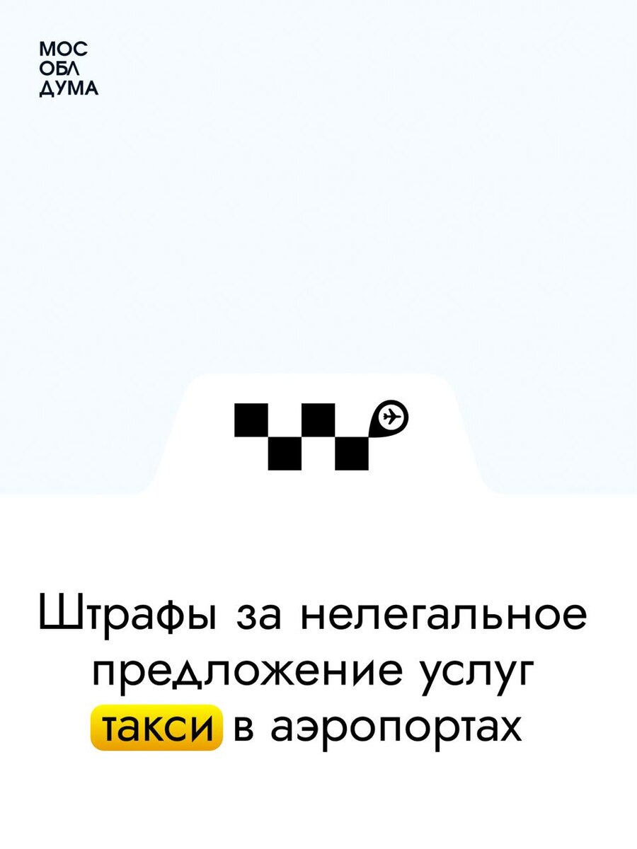 ⚡️Мособлдума ввела штрафы за нелегальное предложение услуг такси в аэропортах. Закон принят на 116-м заседании Ранее постановлением Правительства Московской области был установлен запрет на предложение услуг легкового такси в неположенных местах в аэропортах Подмосковья. Предлагать и оформлять услуги можно только за стойками заказа, которые отвечают всем требованиям законодательства. «Такое решение было принято для того, чтобы пассажиры не сталкивались с нелегальными перевозчиками и навязчивыми «зазывалами», а заказ такси был безопасным и удобным – только через официальные точки. Как правило, таксисты-частники не проходят медосмотры, а машины – технические предрейсовые осмотры. Кроме этого, зачастую поездки на нелегальных такси стоят в разы дороже», – сказал председатель Мособлдумы Игорь Брынцалов. ❗️Привлекать к ответственности за данное правонарушение будут уполномоченные сотрудники Министерства транспорта и дорожной инфраструктуры Московской области. Подробнее на сайте Мособлдум