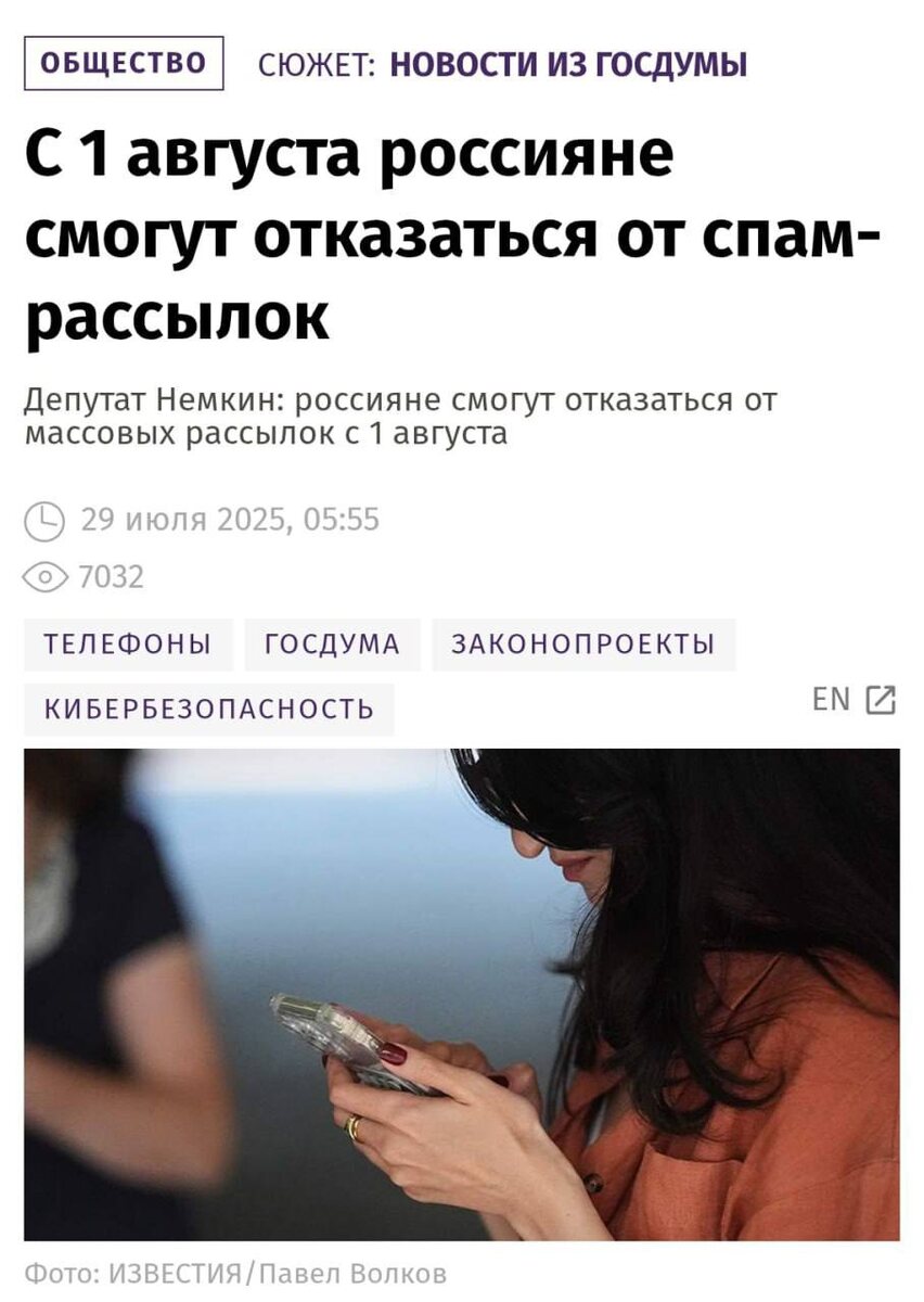 ✉️ С 1 августа россияне смогут полностью отключить спам Телефонные спам-рассылки и навязчивые звонки скоро останутся в прошлом. С нового месяца абоненты смогут раз и навсегда заблокировать нежелательные сообщения и звонки через личный кабинет или приложение своего оператора. Позже пожаловаться на спам можно будет прямо через Госуслуги. Если после отключения рассылки продолжатся — операторы понесут ответственность по закону 🧠TechObserve