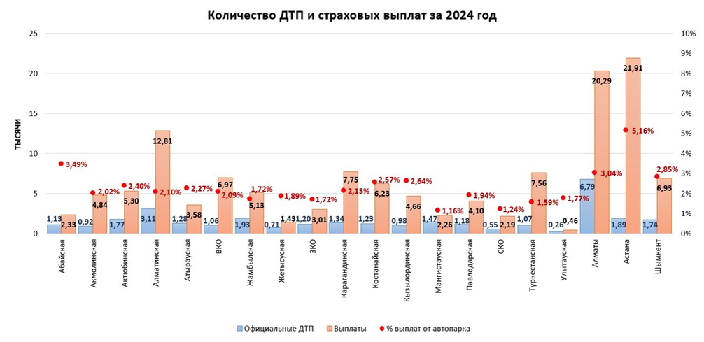 В 2024 году казахстанские страховые компании в рамках обязательного автострахования (ОГПО ВТС) осуществили 131 502 выплаты пострадавшим в ДТП, сообщает пресс-служба СК «Евразия» со ссылкой на данные аналитиков компании. Речь идет о выплатах, осуществленных в 2024 финансовом году, по данным ГКБ. Поскольку страховая выплата происходит с задержкой от даты страхового случая, в статистику попадает часть ДТП конца 2023 года. При этом сопоставимое количество ДТП конца 2024 года попадет в статистику следующего года. В 2024 году наибольшее количество выплат водителям пострадавших транспортных средств было произведено так же, как и годом ранее, в Астане – 21 913, следом идут автовладельцы из Алматы – 20 289 выплат. На третьем месте по выплатам – автомобили, зарегистрированные в Алматинской области – 12 813. При этом, по данным Генеральной прокуратуры РК, в 2024 году было зарегистрировано 31 597 ДТП на дорогах Казахстана, из них 1 950 – со смертельным исходом. Всего же в прошлом году в ДТП постра