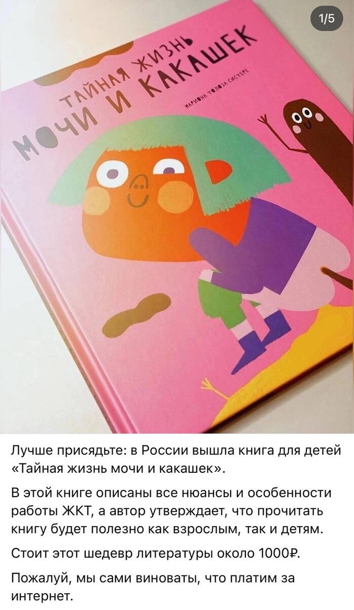 Странная, конечно, тема для того, чтобы вновь вернуться к более менее регулярному ведению этого канала, но как есть 😜 Поговорим про 💩 Вчера в одной из социальных сетей наткнулась на пост о том, что выпустили детскую книгу про то мочу и кал. Клево, подумала я. Какой ужас - написали комментаторы. Зачем нашим деткам это знать - пишут мамочки. Книгу, я не читала, поэтому содержание ее оценить не могу. Но если там простым языком и с картинками рассказывается про то, как функционирует организм человека - то брать стоит. Часто родители дошкольников говорят, что детей интересует так называемый «туалетный юмор». Шутки про какашки - любимая тема. И это нормально!!!! Скажем так, это естественный этап развития ребетенка, связанный с интересом его к своему телу, функциям тела. Проще говоря: как и что устроено. Как правило, подобная тема не обсуждается и не принимается родителями. Что только вызывает интерес у деток. Часто через туалетный юмор они стараются обратить внимание взрослых либо