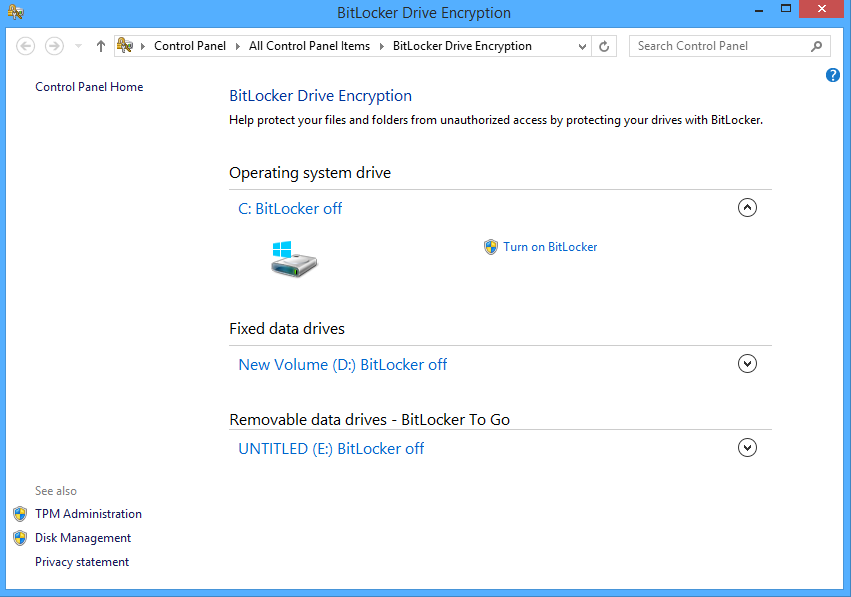 2. По умолчанию BitLocker отключен; вам необходимо включить BitLocker для диска, который вы хотите зашифровать.