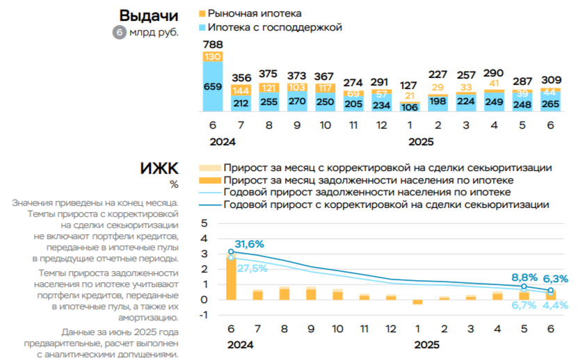 Ⓜ️ По данным ЦБ, в июне 2025 г. портфель кредитов физических лиц увеличился на 98₽ млрд и составил 36,88₽ трлн (0,3% м/м и 4% г/г, в мае +131₽ млрд). В июне 2024 г. он увеличился на 963₽ млрд (существенный резонанс). Можно с уверенностью вещать о стабилизации в розничном кредитовании: потребительский портфель снижается 7 месяцев подряд, данные по автокредитному портфелю в июне вообще скрыли, ипотека стала более адресной, но меры поддержки слегка оживили её. В корпоративном кредитовании существенное снижение относительно прошлого года: 🏠 Темпы роста ипотечного портфеля в июне увеличились на 0,7% (в мае 0,6%), кредитов было выдано на 309₽ млрд (287₽ млрд в мае), в июне 2024 г. выдали 788₽ млрд. Выдача ипотеки с господдержкой составила 265₽ млрд (248₽ млрд в мае), почти вся выдача приходится на семейную ипотеку — 222₽ млрд (в мае 209₽ млрд). Рыночная продолжает находиться на низких уровнях — 44₽ млрд (39₽ млрд в мае), жёсткая ДКП не оставляет шанса потребителям. В мае продолжилось оживле