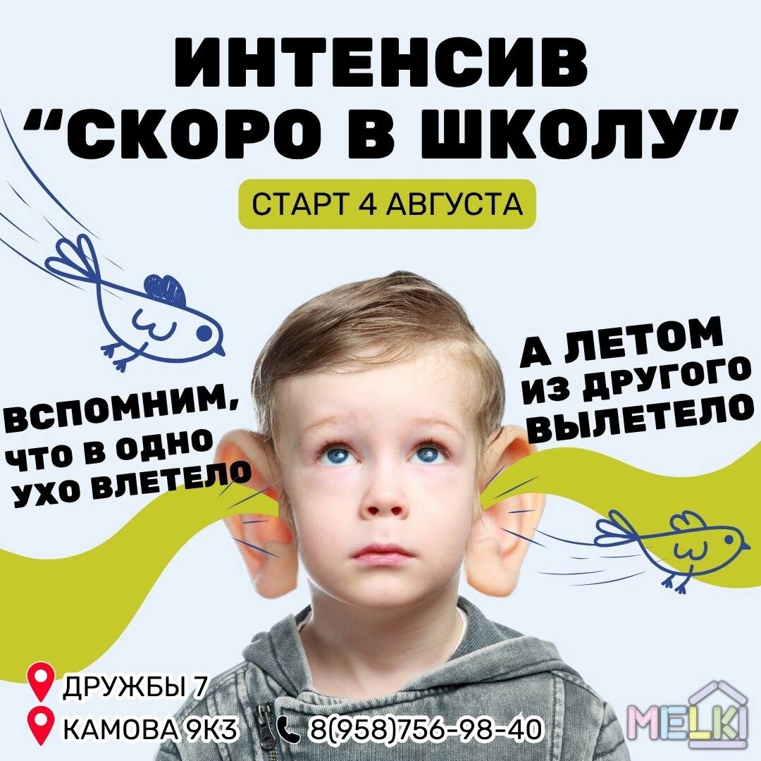 🎒Интенсив «Скоро в школу» в MELKI!📚 Каникулы почти закончились — пора стряхнуть песок с учебников и разбудить спящие в голове знания! 😄 Спокойно, мягко и без стресса, но с мощной мозговой зарядкой — именно так мы готовим ребят к новому учебному году 🔄 👩🏫 У нас две группы: ✨ будущие первоклассники ✨ ребята, идущие во второй класс На занятиях: ✔ Повторим чтение, письмо, математику ✔ Прокачаем память, внимание, мышление ✔ Настроимся на учёбу в тёплой, дружелюбной атмосфере — без занудства и скуки! 📅 Старт 4 августа 🎯 Всего 6 мест — записывайтесь сейчас, пока они есть! Превратим знания из "улетели" в "уложились" 💡 📲 Запись по ссылке: wa.me/+79587569840