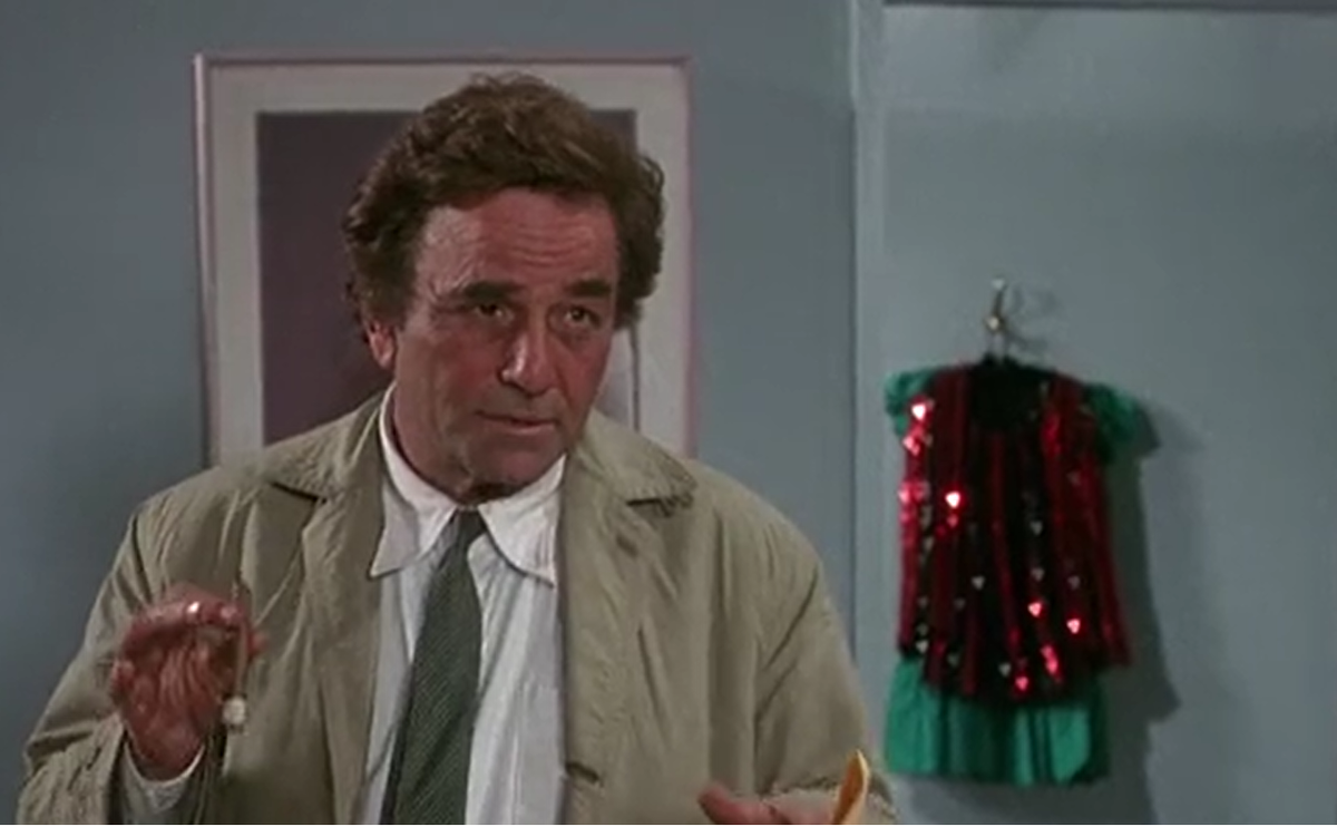 Да ещё несуразность. Почему-то Коломбо смущает, что она была в белых гольфах. Много времени в фильме уделяется тому, что белые гольфы она могла одеть только под джинсы.