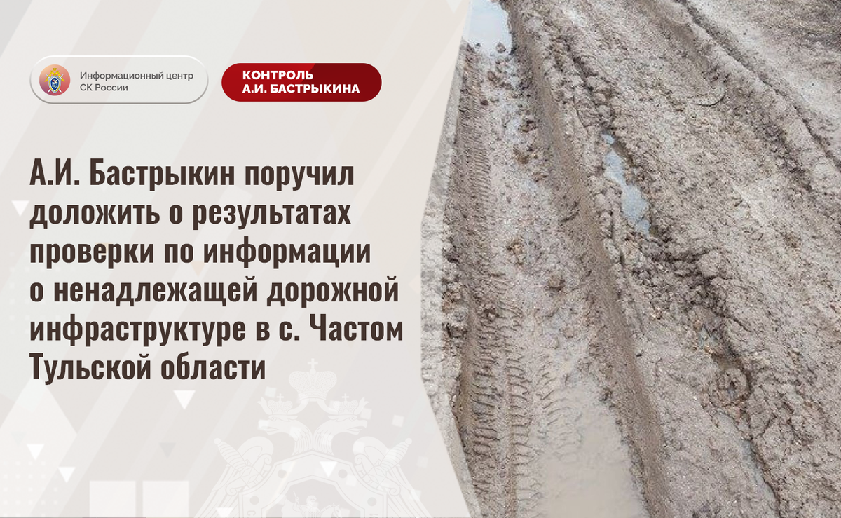 А.И. Бастрыкин поручил доложить о результатах проверки по информации о ненадлежащей дорожной инфраструктуре в с. Частом Тульской области В сети Интернет сообщается о нарушении прав жителей села Частого Тульской области на качественную дорожную инфраструктуру. На протяжении длительного времени автодорога по улице Частинской, систематически используемая крупногабаритными транспортными средствами, находится в непригодном состоянии: на поверхности образовались многочисленные ямы, при выпадении осадков неасфальтированное полотно размывается. В связи с этим проезд автомобилей к домовладениям затруднен. Обращения в компетентные органы результатов не принесли, мер к разрешению ситуации не принято. В СУ СК России по Тульской области организована процессуальная проверка. Председатель Следственного комитета Российской Федерации Александр Иванович Бастрыкин поручил и.о. руководителя СУ СК России по Тульской области Никите Петровичу Севостьянову Усову доложить о промежуточных результатах процессуа