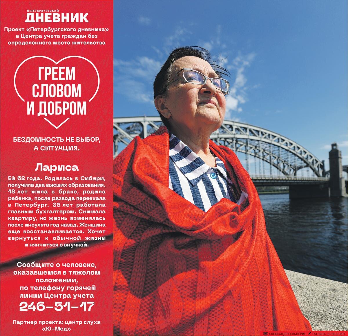 ❤️🩹 Греем словом и добром: история Ларисы «Петербургский дневник» совместно с Центром учёта граждан без определённого места жительства продолжает свою акцию «Греем словом и добром». В этот раз петербуржцам рассказали о жительнице Северной столицы Ларисе. Ей 62 года. Родилась в Сибири, получила два высших образования. 18 лет жила в браке, родила ребенка, после развода переехала в Петербург. 35 лет работала главным бухгалтером. Снимала квартиру, но жизнь изменилась после инсульта год назад. Женщина еще восстанавливается. Хочет вернуться к обычной жизни и нянчиться с внучкой. Сообщить о человеке, оказавшемся в тяжёлом положении, можно по телефону горячей линии Центра учёта 246-51-17. Фото: Александр Гальперин Петербургский дневник