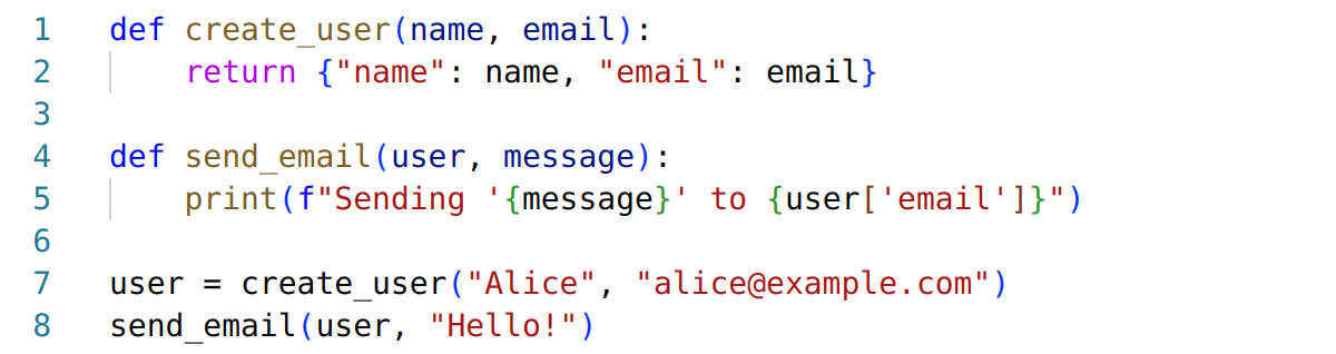 Класс User хранит и данные (name, email), и методы (send_email) в одном месте. Так код легче поддерживать.