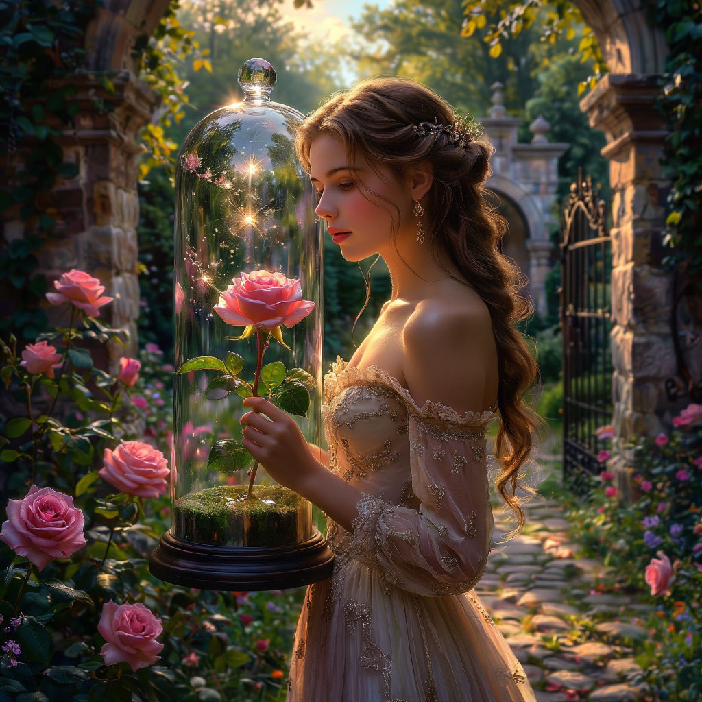 В тихом саду, где сумерки сплетались с серебристым светом, жила прекрасная роза. Ее лепестки, нежные как шепот, были спрятаны под хрустальным колпаком — так смотрительница сада, Элиана, оберегала ее от ветра, дождя и всего, что могло нарушить ее хрупкую совершенность. Каждый вечер Элиана приходила к розе, любуясь ее красотой, но в ее глазах таилась грусть. Сад вокруг был полон жизни: плющ обнимал древние стены замка, дорожки звали вглубь таинственных аллей, а за железными воротами, покрытыми ржавчиной времени, лежала неизвестность — мир за пределами уютных стен. Однажды, когда луна окрасила сад в сизые тона, роза заговорила. Ее голос был тихим, как шорох листьев: «Почему ты держишь меня в клетке из стекла? Я не чувствую ни утренней росы, ни тепла солнца. Мои корни забыли, что значит бороться за жизнь». Элиана вздрогнула. Она никогда не задумывалась, что защита может стать тюрьмой. «Я боюсь, что ты увянешь», — прошептала она, касаясь холодного колпака. «