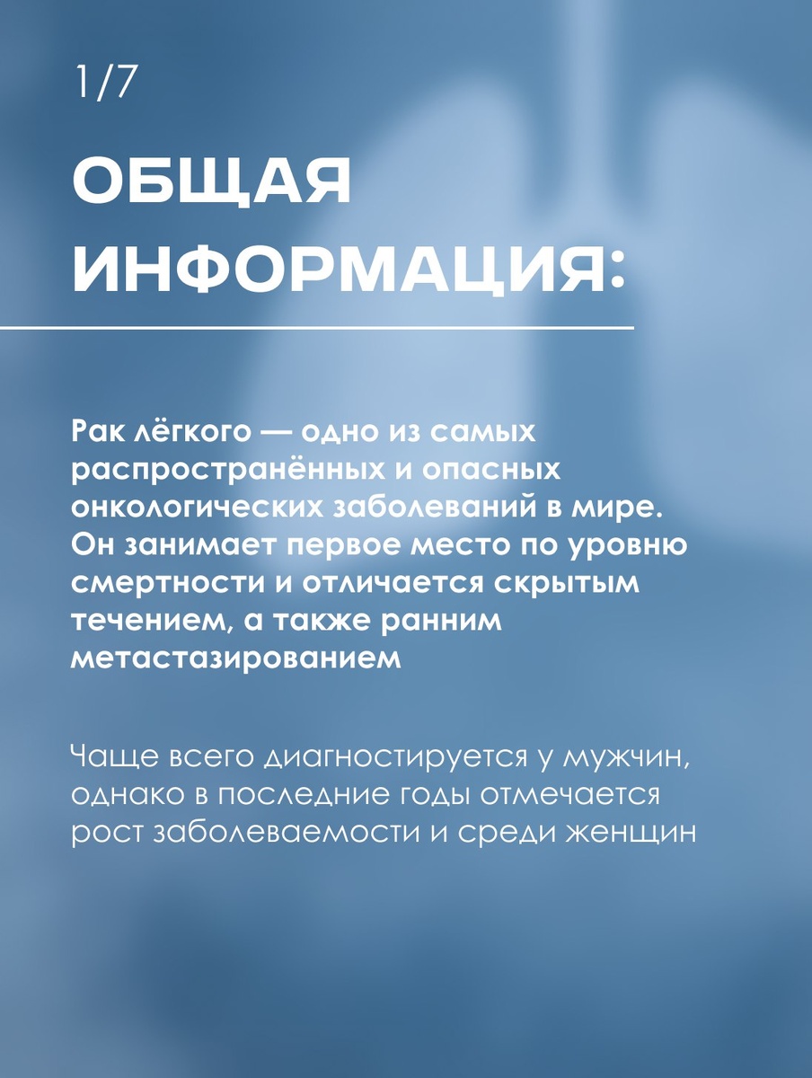 Профилактика рака легкого: что необходимо знать каждому. Рак лёгкого — коварное заболевание, которое развивается незаметно для пациента и часто диагностируется на поздних стадиях. В карточках мы собрали всю необходимую информацию о профилактике и раннем выявлении этого злокачественного заболевания. Листайте вправо, чтобы узнать больше.