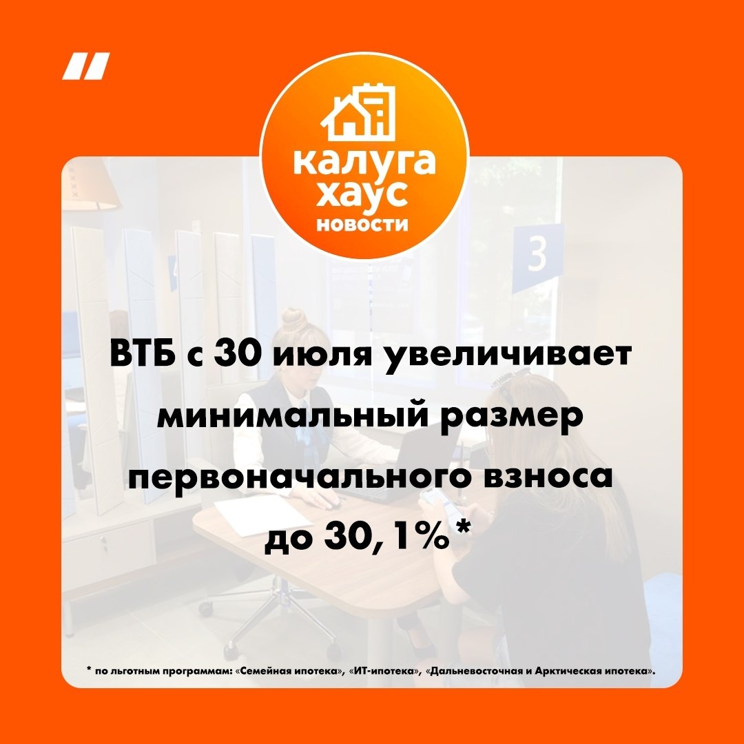 ✅Текущий размер первоначального взноса сохранится: ● Для застройщиков на проектном финансировании ВТБ ● По программе «Льготная ипотека на новых территориях» – от 10.1%, ● По программе «Комбинированная ипотека» – от 20.1%, ● Внутреннее рефинансирование по Семейной ипотеке – к/3 до 79.9%. #калугахаус_новости