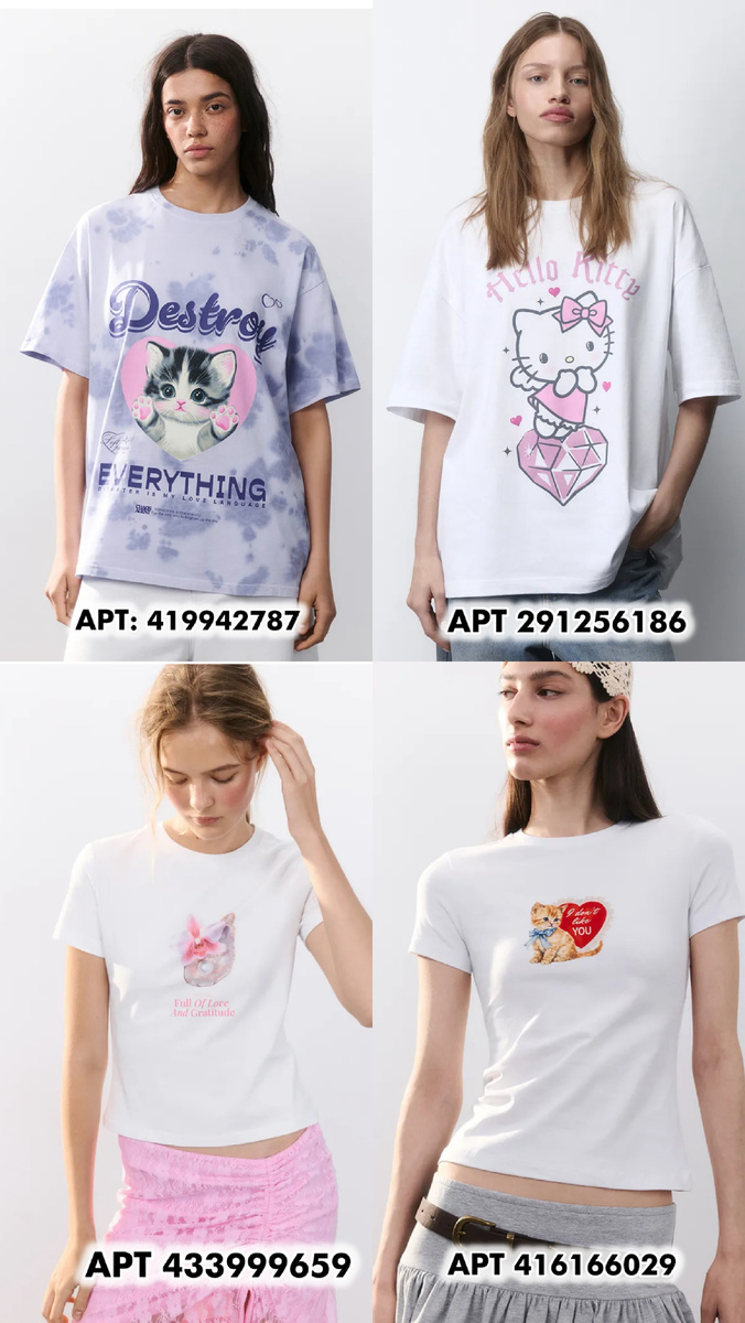Футболки с котиками, Hello Kitty, наивной графикой и фразами вроде «Destroy Everything» или «Full of Love and Gratitude» снова в игре. Они будто перенеслись из нулевых в TikTok-реальность. Такие футболки теперь носят не только тинейджеры — а и стилисты, комбинируя их с дерзкими юбками, денимом и многослойными образами.