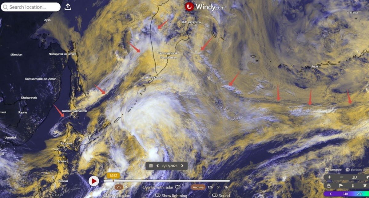 Вот эта картиночка, трассирующая угол Тихоокеанской плиты (не самая четкая и явная) от 27 июня тянула по формуле на М8.4+/-0.2